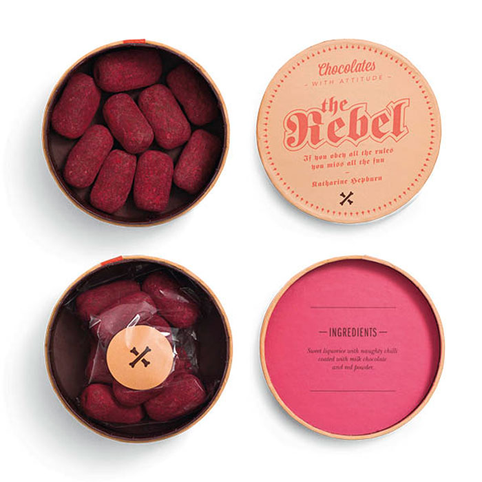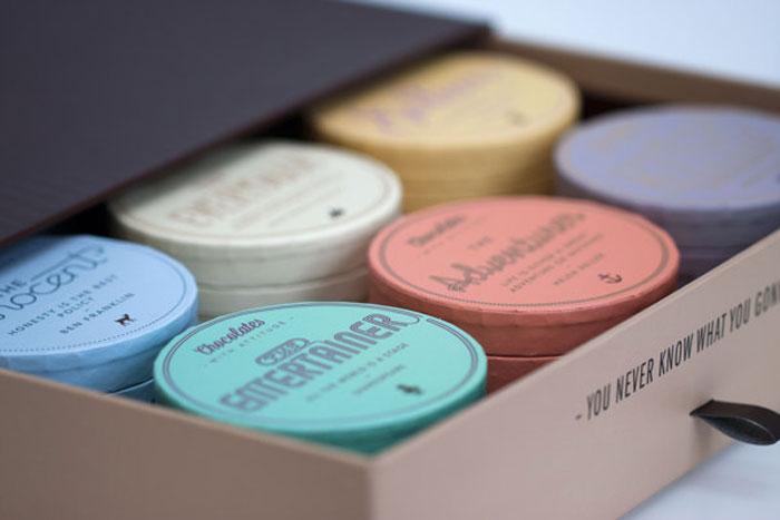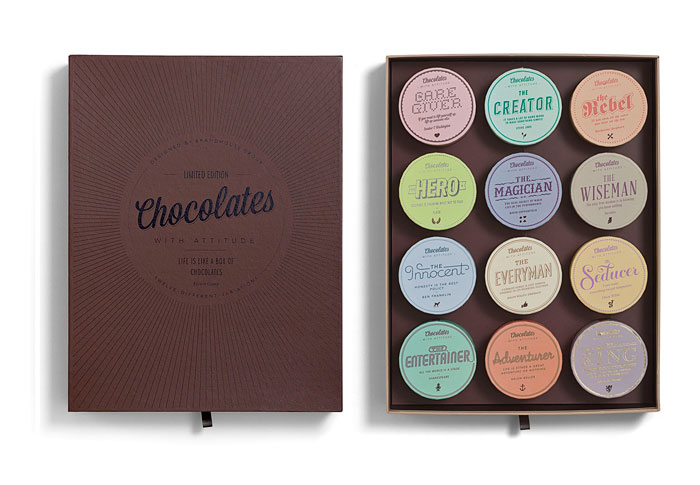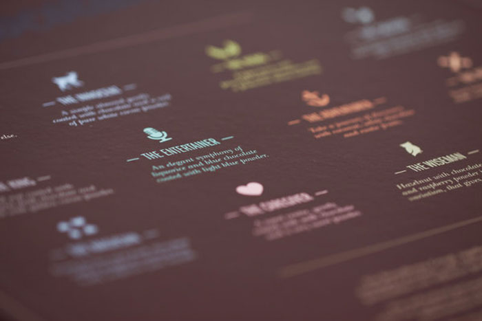 “個性是通過一個獨(dú)特的報價,一個獨(dú)特的設(shè)計和獨(dú)特的類型的巧克力表達(dá)。設(shè)計區(qū)分了12種不同的字體,字體的使用,這些小字體是圓形的,像是小帽子。巧克力是可口精品巧克力獨(dú)特的配方了。一切都是從地上發(fā)展的。”