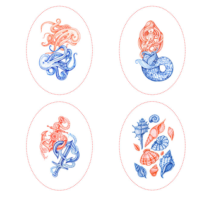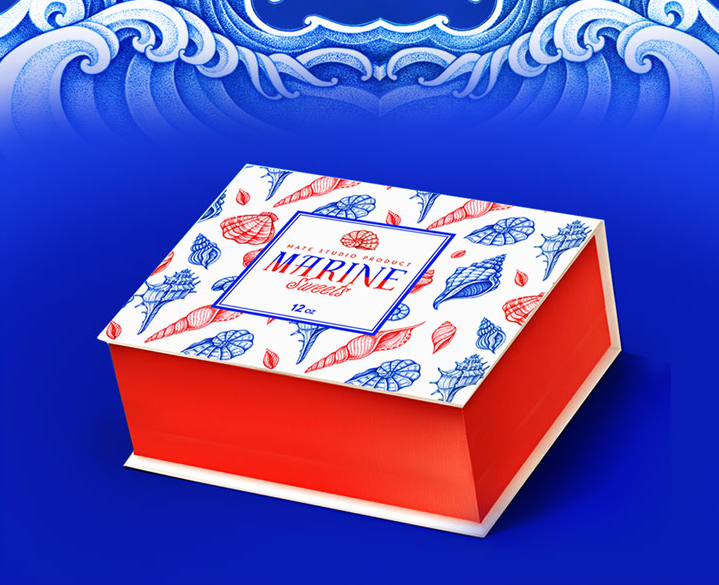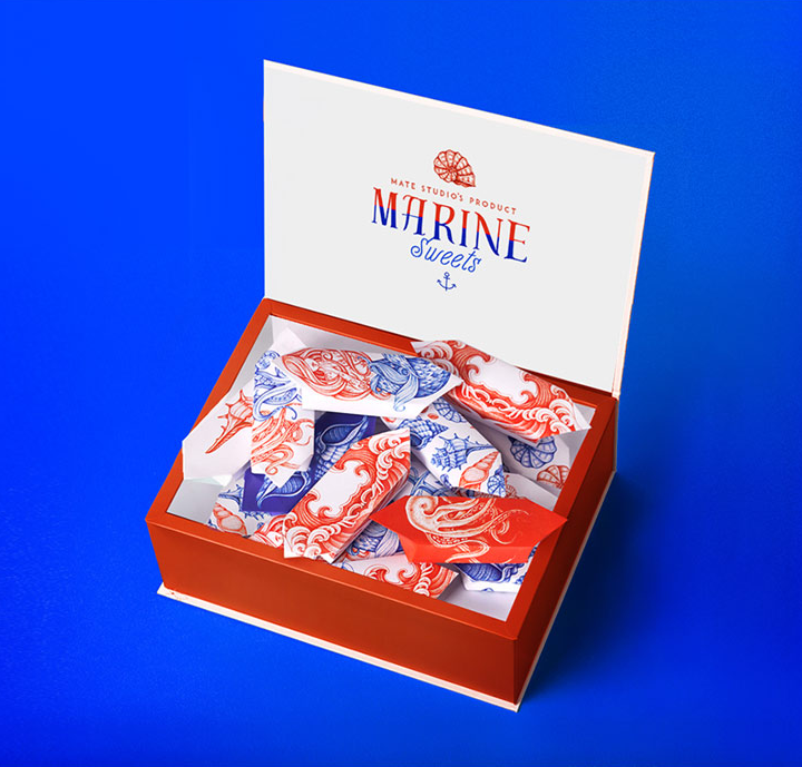這條由伴侶工作室設(shè)計的糖果制作精美,在一個干凈的白色表面上使用華麗的紅色和藍色的插圖。圖紙是復雜的,優(yōu)雅的手繪線的組合收斂。美麗的海上圖案被翻譯在外包裝上,并在個別包裝上,每一個甜蜜的折疊在一個豐富多彩的封面。